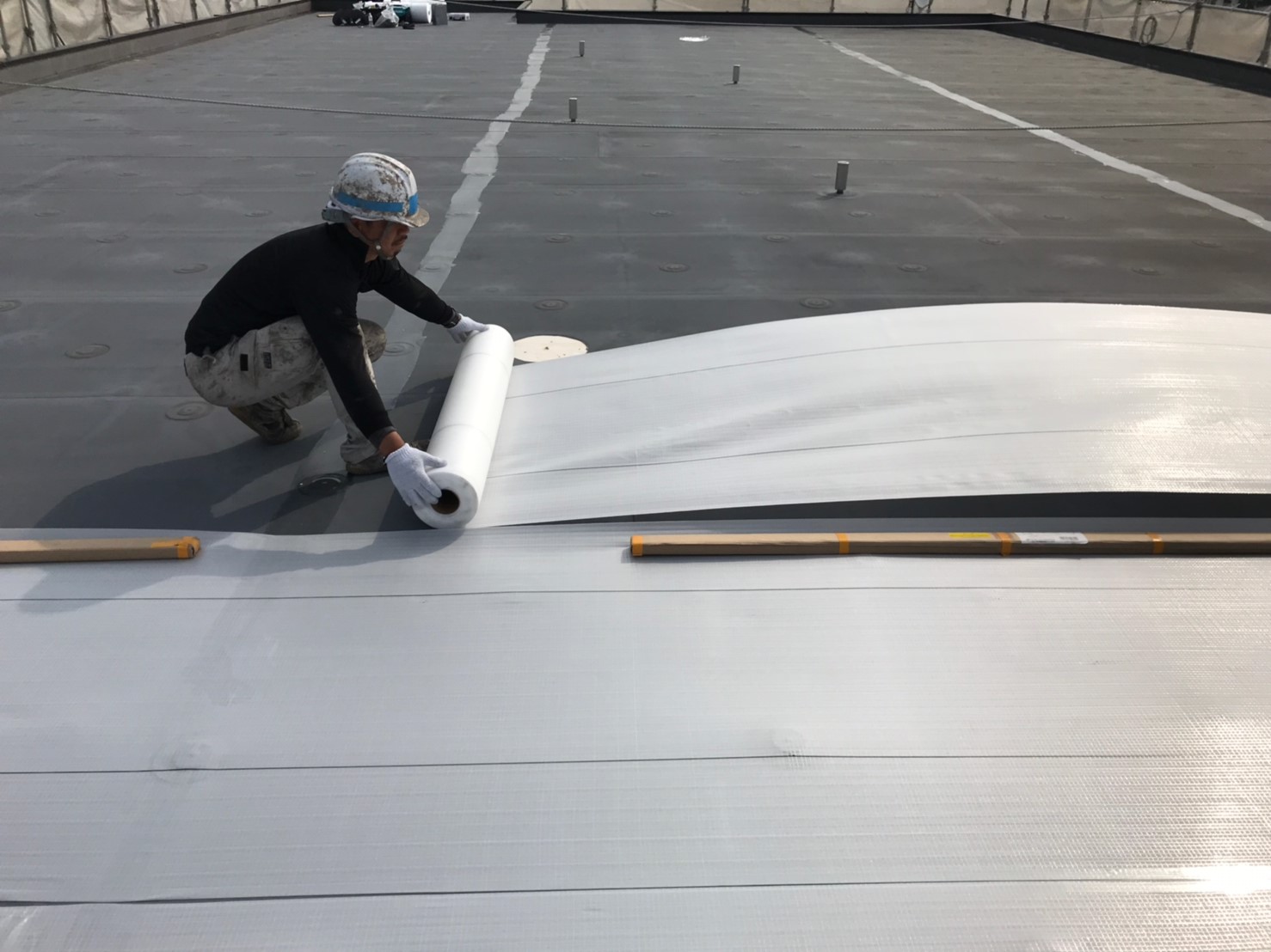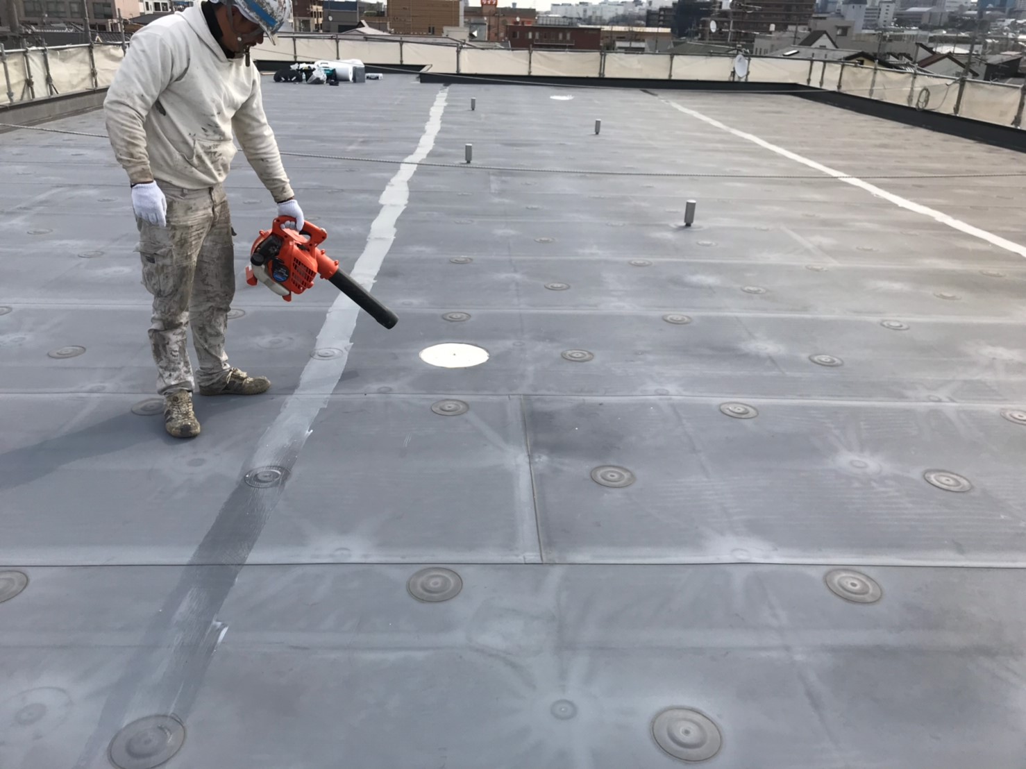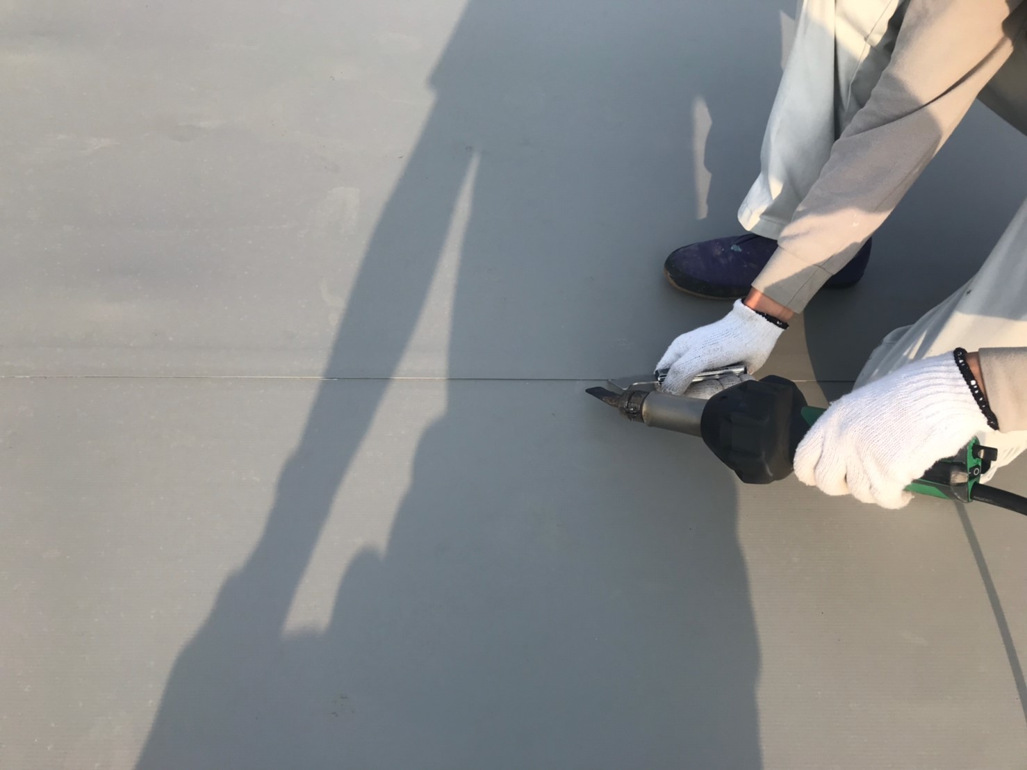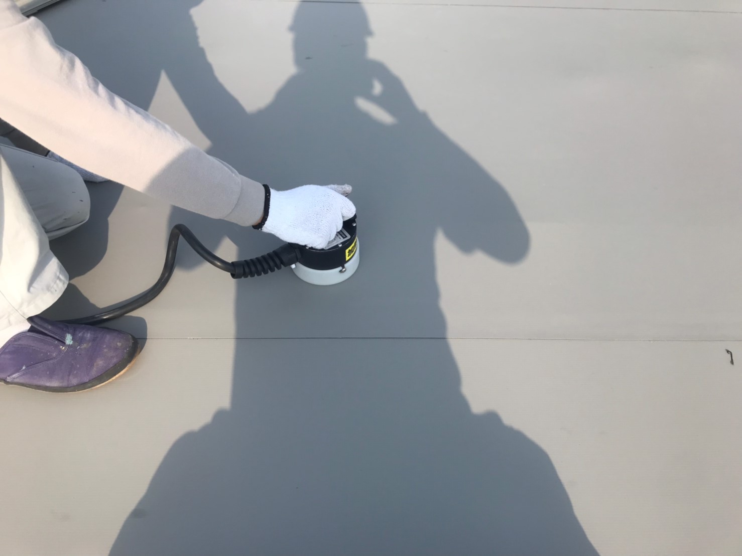 塩ビシート防水工事 現状 ↓ ケレン・清掃 ↓ ラジアルシート敷き込み ↓ 塩ビ鋼板取付け ↓ 塩ビディスク取付け ↓ 改修用ドレン取付け ↓ 塩ビシート敷き込み ↓ ジョイント液溶着 ↓ ジョイント熱融着 ↓ 立上りボンド塗布 ↓ 立上り塩ビシート貼り ↓ ジョイントシール打設 ↓ IHディスクヒーター使用 ↓ 端末シール打設 ↓ 完了