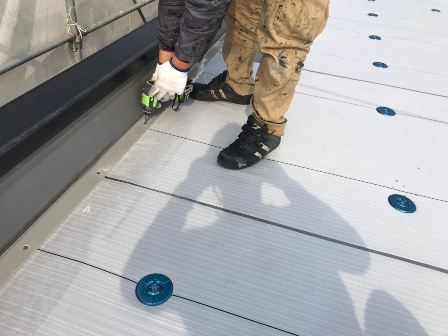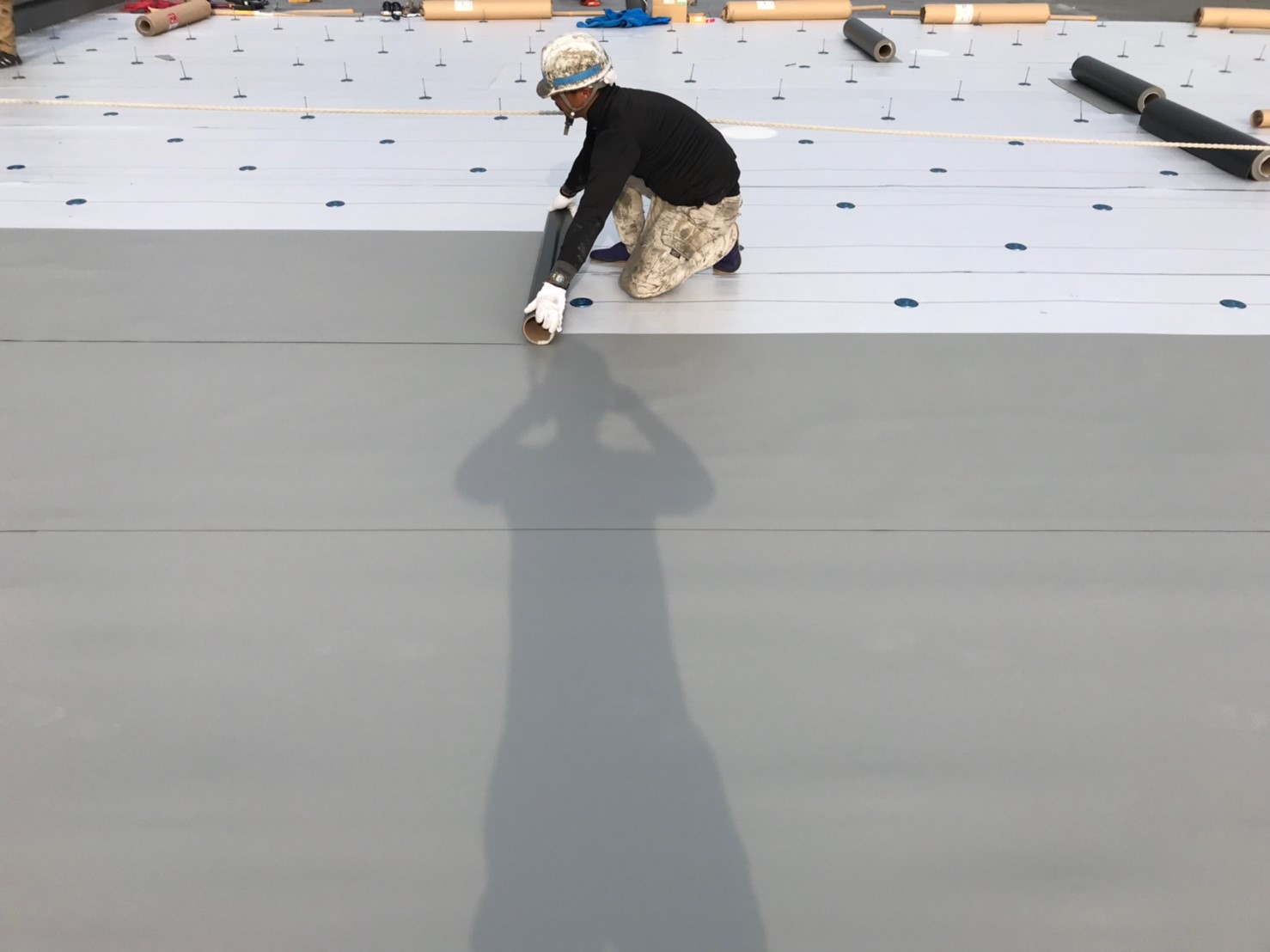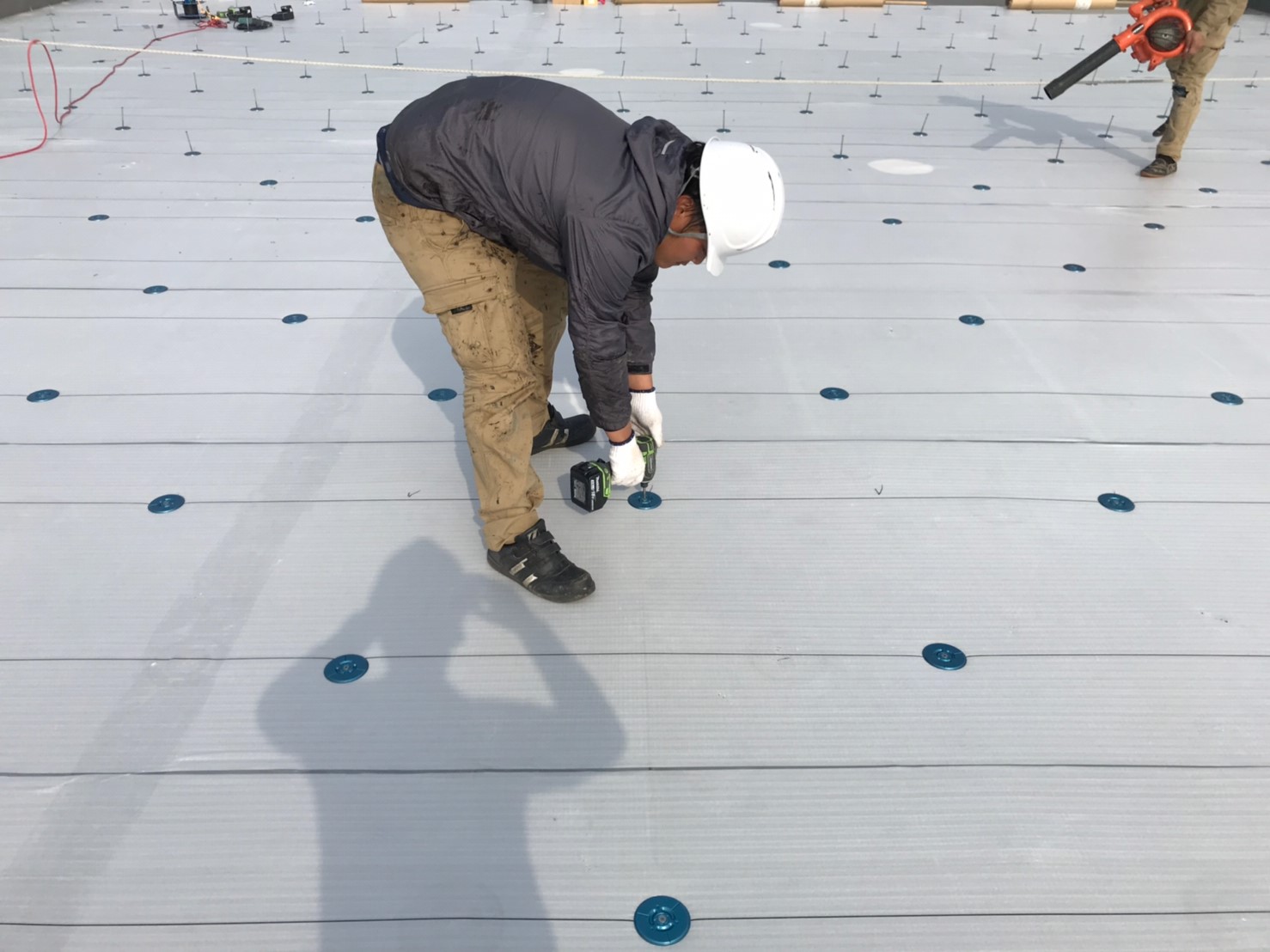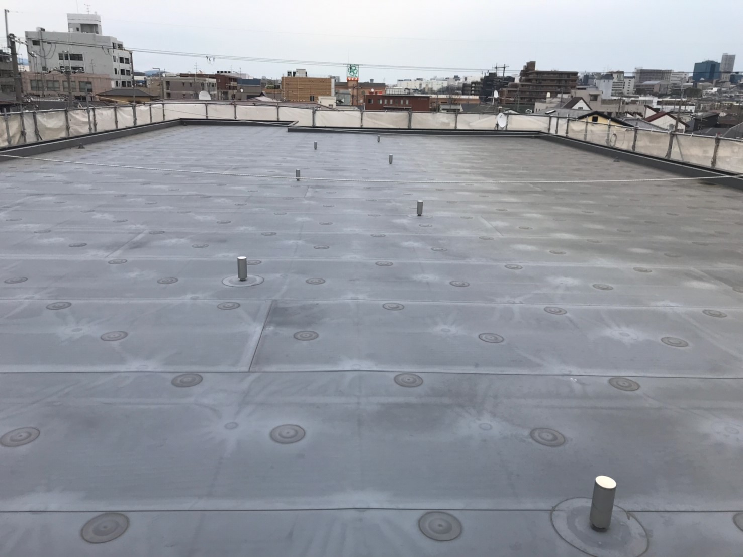 塩ビシート防水工事 現状 ↓ ケレン・清掃 ↓ ラジアルシート敷き込み ↓ 塩ビ鋼板取付け ↓ 塩ビディスク取付け ↓ 改修用ドレン取付け ↓ 塩ビシート敷き込み ↓ ジョイント液溶着 ↓ ジョイント熱融着 ↓ 立上りボンド塗布 ↓ 立上り塩ビシート貼り ↓ ジョイントシール打設 ↓ IHディスクヒーター使用 ↓ 端末シール打設 ↓ 完了