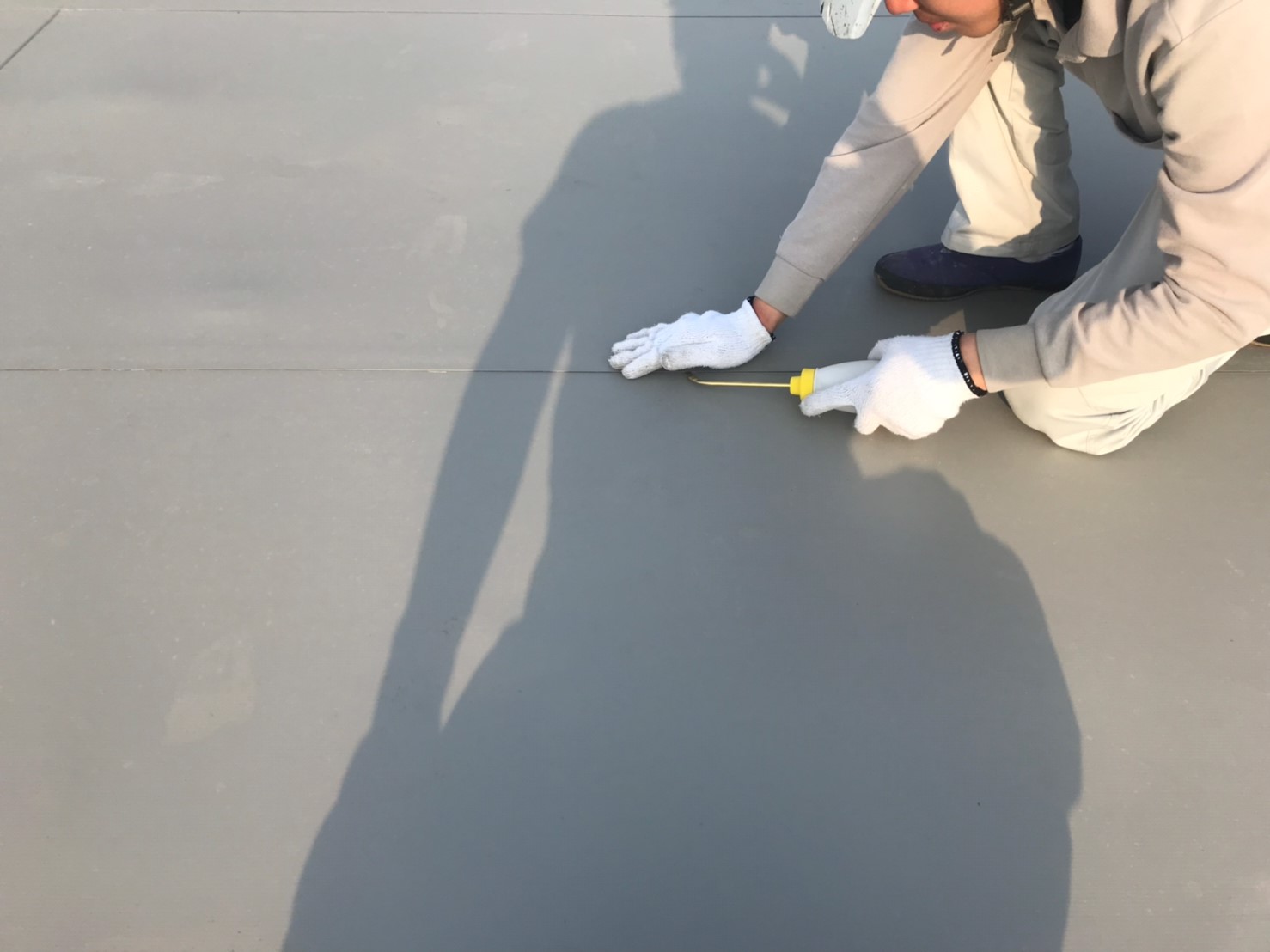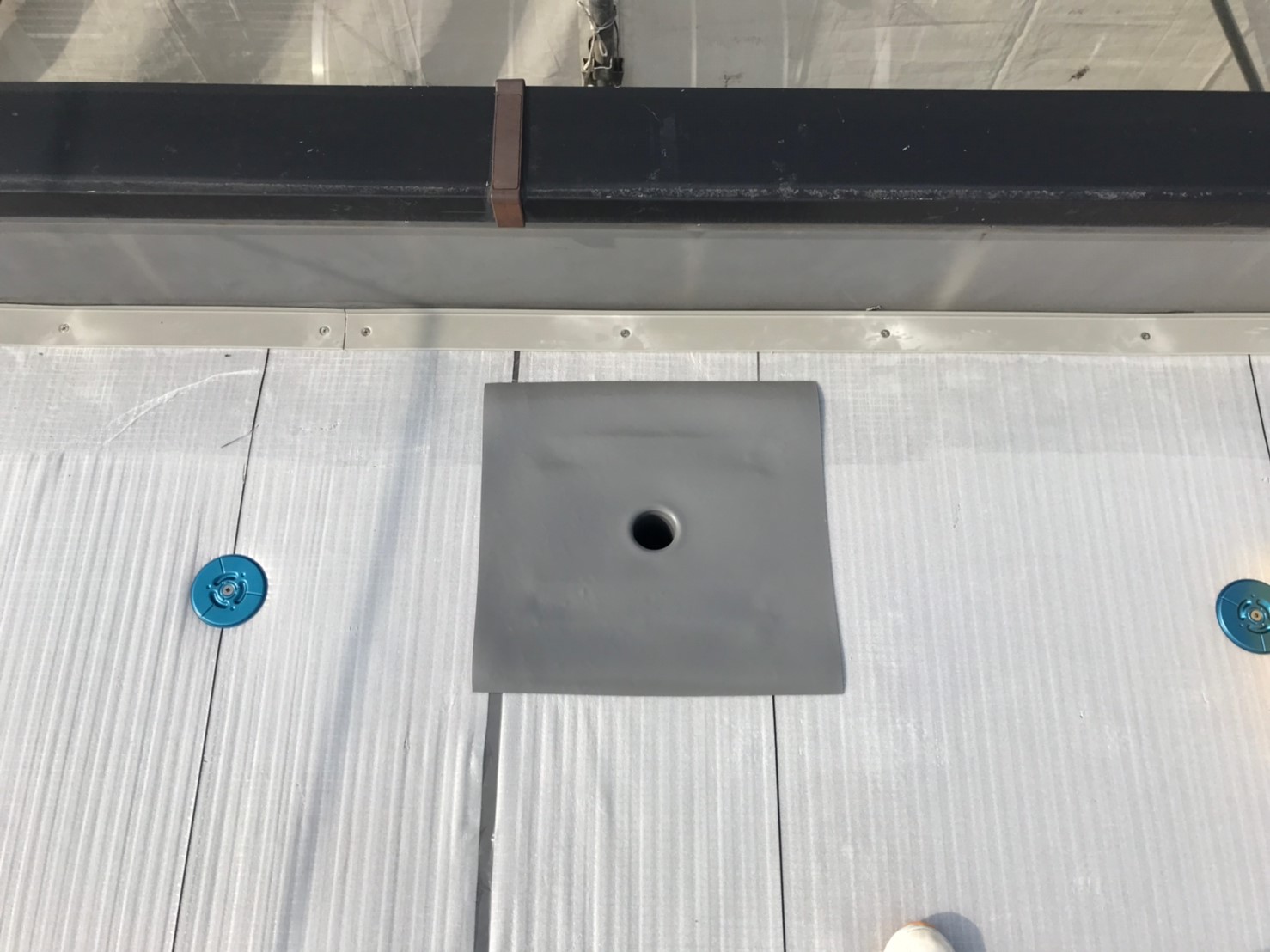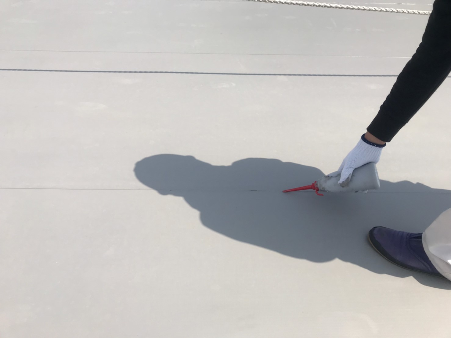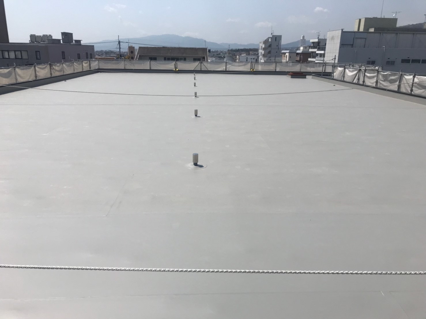 塩ビシート防水工事 現状 ↓ ケレン・清掃 ↓ ラジアルシート敷き込み ↓ 塩ビ鋼板取付け ↓ 塩ビディスク取付け ↓ 改修用ドレン取付け ↓ 塩ビシート敷き込み ↓ ジョイント液溶着 ↓ ジョイント熱融着 ↓ 立上りボンド塗布 ↓ 立上り塩ビシート貼り ↓ ジョイントシール打設 ↓ IHディスクヒーター使用 ↓ 端末シール打設 ↓ 完了